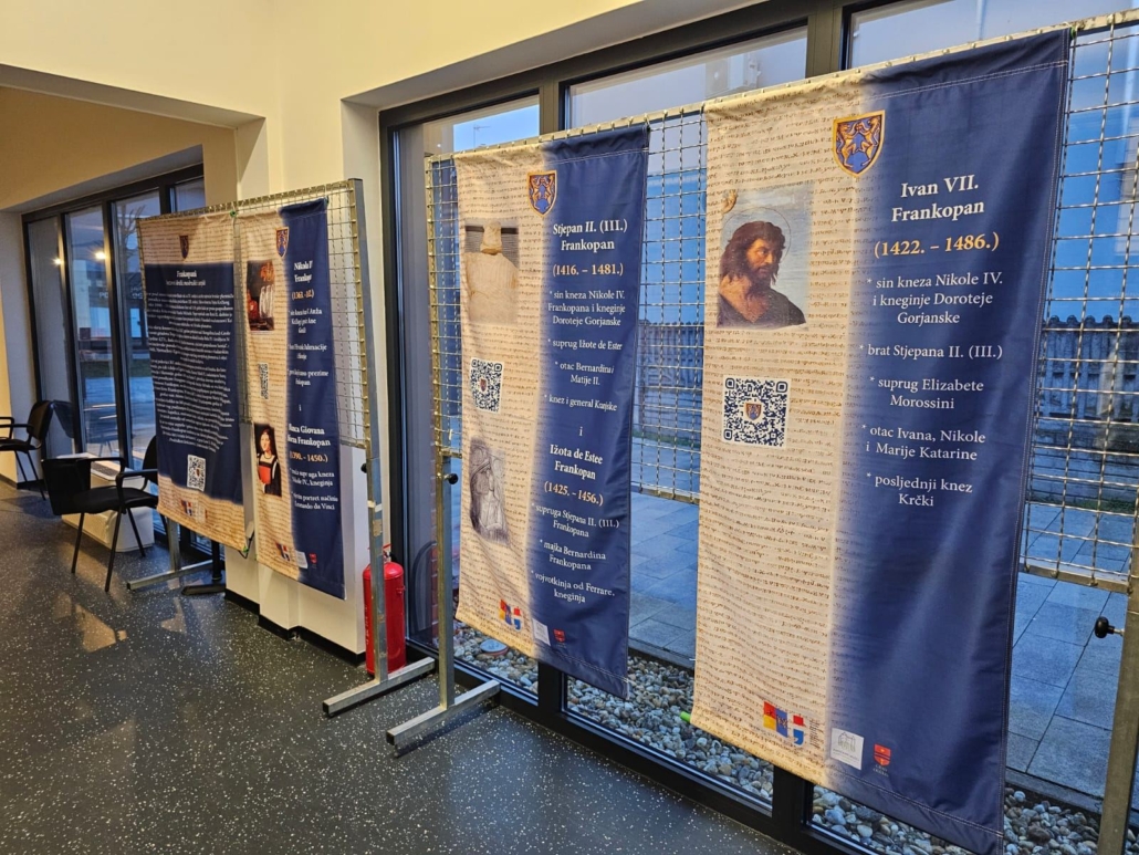Izložbeni postav „Portreti Frankopana“ sastoji se od 9 postera, kojima je u podlozi deveti od 14 sačuvanih listova Frankopanskog kodeksa.