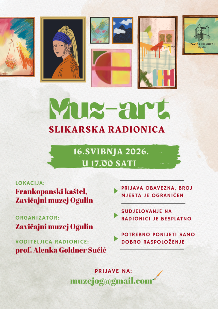 Povodom Međunarodnog dana muzeja, koji se obilježava svakog svibnja, Zavičajni muzej Ogulin organizira besplatnu slikarsku radionicu pod nazivom „Muz-art“ koju će voditi akademska slikarica i profesorica likovne kulture, naša Ogulinka Alenka Goldner Sučić, GoldArt.