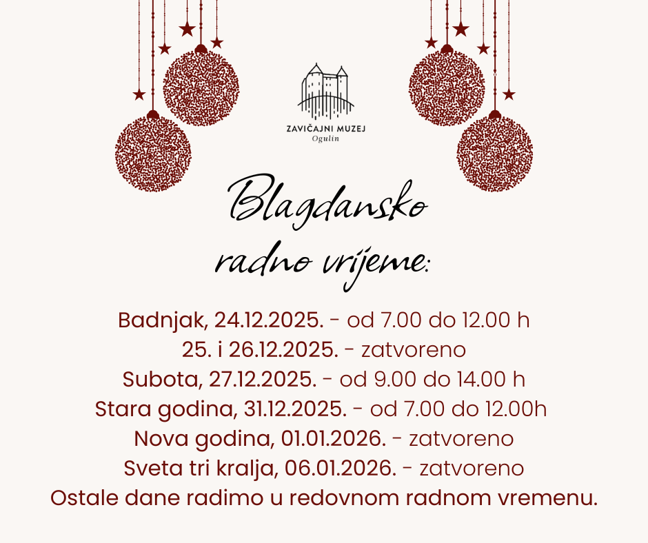 Zavičajni muzej Ogulin će povodom nadolazećih božićnih i novogodišnjih blagdana raditi prema prilagođenom radnom vremenu.