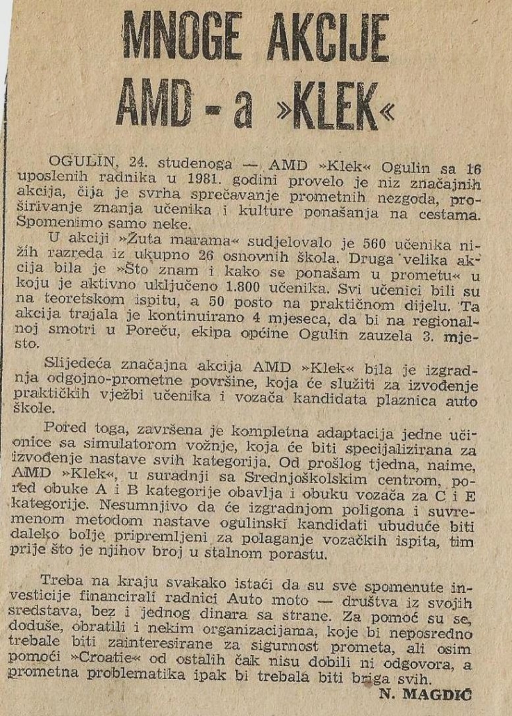 Jedan takav primjer zabilježen je u Ogulinu 1981. godine, kada je Auto-moto društvo „Klek“ provelo niz zapaženih i društveno iznimno vrijednih akcija, o čemu je izvijestio Novi list u članku pod naslovom „Mnoge akcije AMD-a ‘Klek’“.