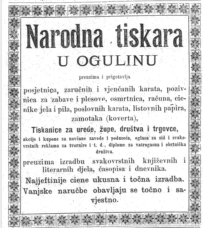 Posebno mjesto zauzima Narodna tiskara u Ogulinu, koja se oglašava kao suvremena i svestrana ustanova sposobna odgovoriti na potrebe uprave, župa, društava, trgovaca i pojedinaca. U njezinoj ponudi nalaze se posjetnice, zaručničke i vjenčane karte, pozivnice za zabave i plesove, osmrtnice, računi, cjenici, poslovne karte, listovni papiri i koverte, ali i tisak knjiga, časopisa i dnevnika.