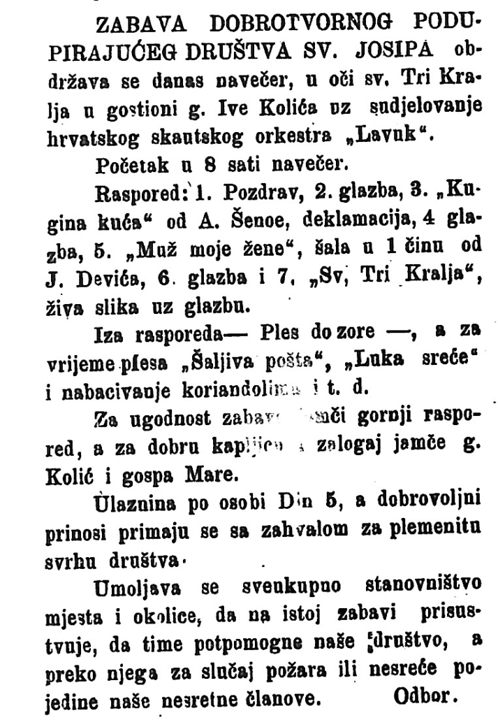 Ulaznica je iznosila 5 dinara, a dobrovoljni prilog bio je namijenjen fondu Društva za pomoć članovima koji bi se našli u nevolji — bilo zbog požara ili drugih nesretnih okolnosti.